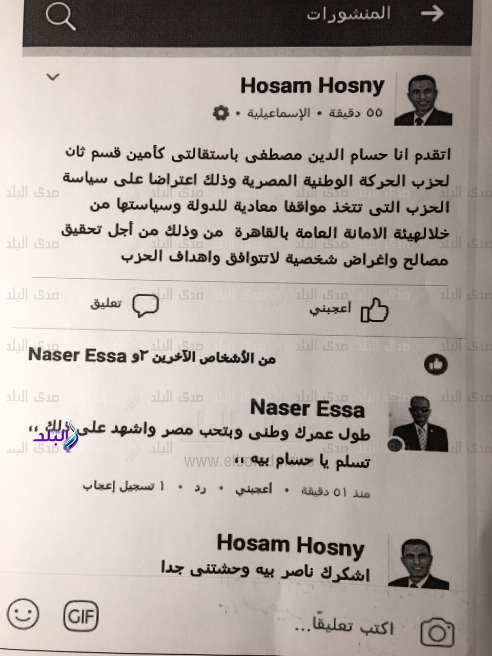فيما أكد حسام الدين مصطفى، أمين قسم ثانٍ حزب الحركة الوطنية بالإسماعيلية، أنه يعترض على سياسة الحزب المعادية للوطن والتي تغلب المصالح الشخصية على مصالح مصر.