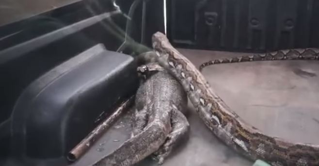 شاهد .. سحلية ضخمة تخرج من بطن ثعبان عملاق