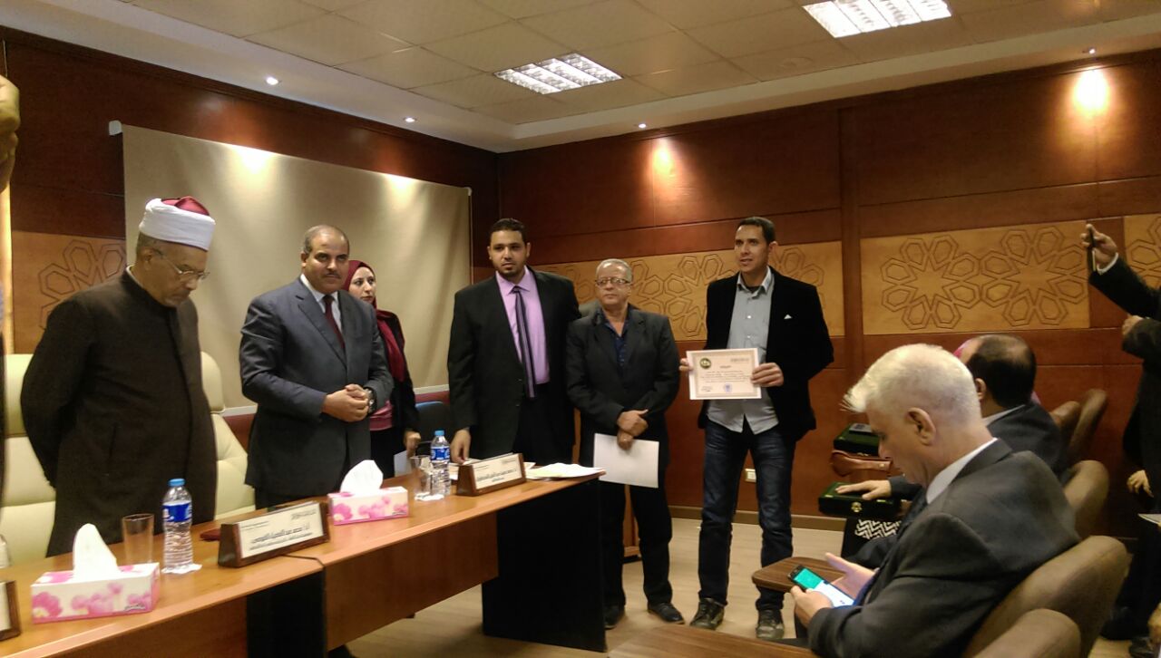 كرمت المنظمة العالمية لخريجي الأزهر الباحثين والطلاب الذين اجتازوا الدورات التدريبية في مشروع سفراء الأزهر بحضور الدكتور عبدالفضيل القوصي نائب رئيس مجلس إدارة المنظمة والدكتور عبدالدايم نصير مستشار شيخ الأزهر واللواء أسامه ياسين نائب رئيس مجلس إدارة المنظمة .