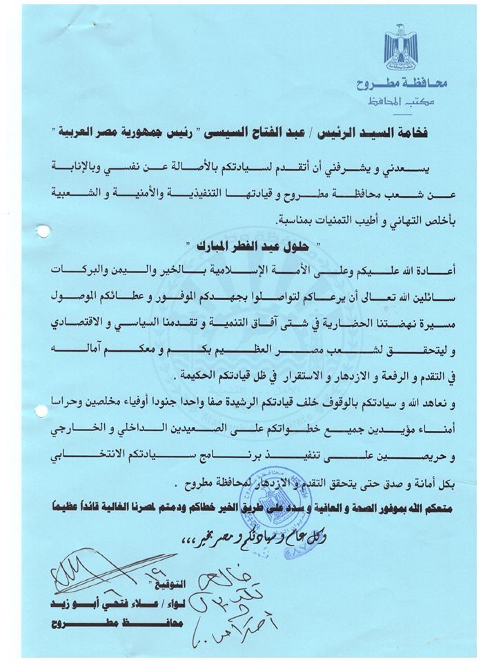 "نعاهد الله وسيادتكم بالوقوف خلف قيادتكم الرشيدة صفا واحدا جنودا أوفياء مخلصين وحراسا أمناء مؤيدين جميع خطواتكم على الصعيدين الداخلي والخارجي وحريصون على تنفيذ برنامج سيادتكم الانتخابي بكل أمانة وصدق وإخلاص حتى يتحقق التقدم والازدهار لمحافظة مطروح، متعكم الله بموفور الصحة والعافية وسدد على طريق الخير خطاكم ودمتم لمصرنا الغالية قائدًا عظيمًا وكل عام وسيادتكم ومصر بخير".