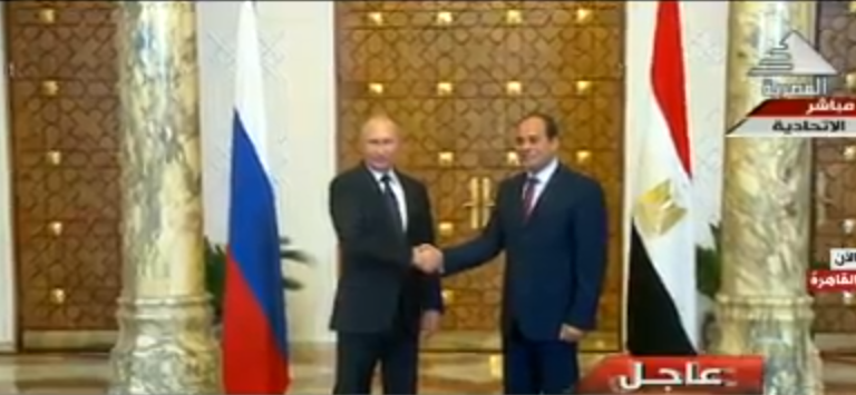 ووصل منذ قليل الرئيس الروسي فلاديمير بوتين، إلى القاهرة للقاء نظيره المصري عبد الفتاح السيسي، فضلًا عن استقبال مطار القاهرة وفدين روسيين رفيعى المستوى قادمين على طائرتين خاصتين من موسكو قبل وصول الرئيس الروسى " فلاديمير بوتين " لمصر للقاء الرئيس " السيسى " وبحث التعاون وآخر التطورات.