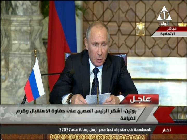 أعرب الرئيس الروسي فلاديمير بوتين عن سعادته بزيارته للقاهرة، وحفاوة استقبال الرئيس عبدالفتاح السيسي له، مضيفا: "أجرينا مع الرئيس السيسي مباحثات مشتركة غنية المضمون وتم تحديد خطوات العمل المشترك وسبل التعاون بين البلدين فى المستقبل".