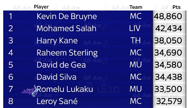 واحتل النجم البلجيكي كيفن دي بروين لاعب مانشيستر سيتي المركز الأول كأفضل لاعبي الدوري الإنجليزي للموسم الحالي، فيما جاء النجم المصري محمد صلاح في المركز الثاني، ثم هاري كين مهاجم توتنهام في المركز الثالث.