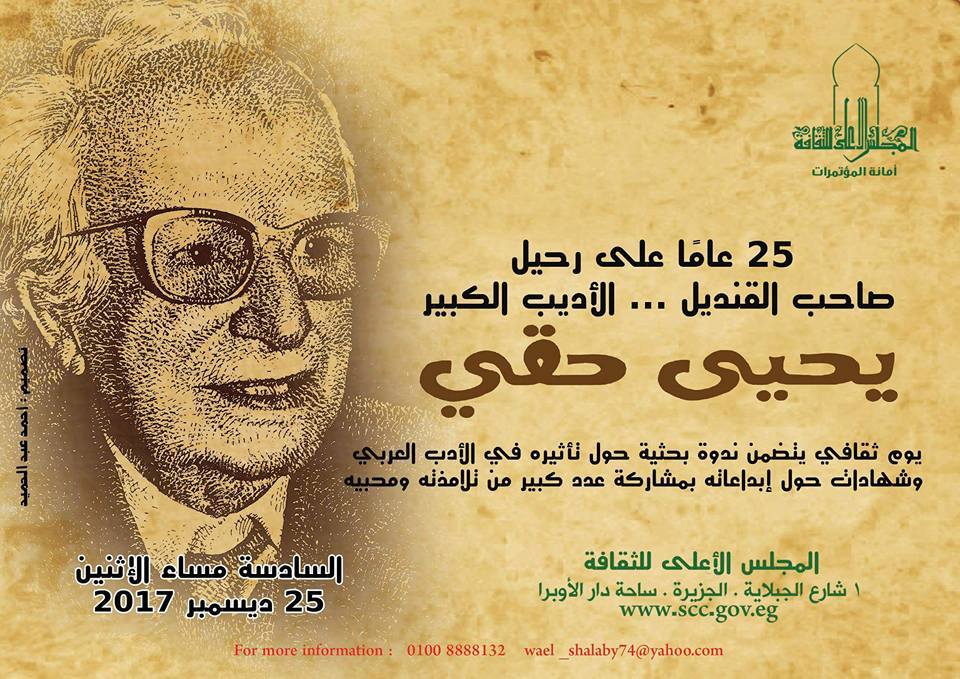ويلقى "النمنم"، والدكتور جابر عصفور، وزير الثقافة الأسبق، والدكتور حاتم ربيع، الأمين العام للمجلس، وابنة الأديب نهى يحيى حقى، كلمة فى بداية الأمسية، يعقبها شهادات حول إبداعاته من الفنانة الكبيرة سميحة أيوب، ود. أحمد درويش، ود. سميح شعلان، ود. جلال أمين، والناقد طارق الشناوي، ود. خالد منتصر، وسامي فريد.