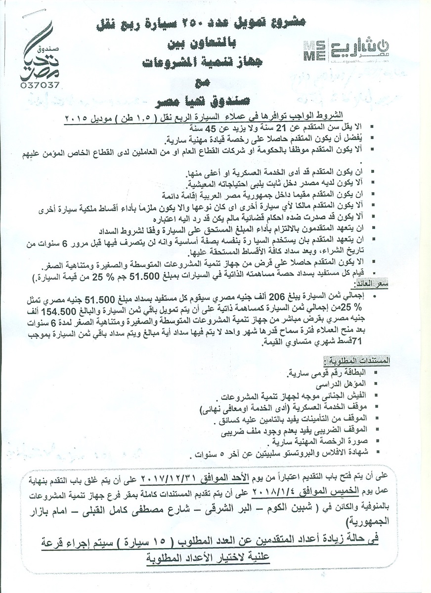 واشتملت المستندات المطلوبة من المتقدمين علي بطاقة رقم قومي سارية والمؤهل الدراسي والفيش الجنائي الموجه لجهاز تنمية المشروعات وموقف الخدمة العسكرية { أدي الخدمة أو معافي منها } والموقف من التأمينات يفيد بالتأمين عليه كسائق والموقف الضريبي يفيد بعدم وجود ملف ضريبي وصورة الرخصة المهنية سارية وشهادة الإفلاس والبروتستو سلبيتين عن آخر 5 سنوات.