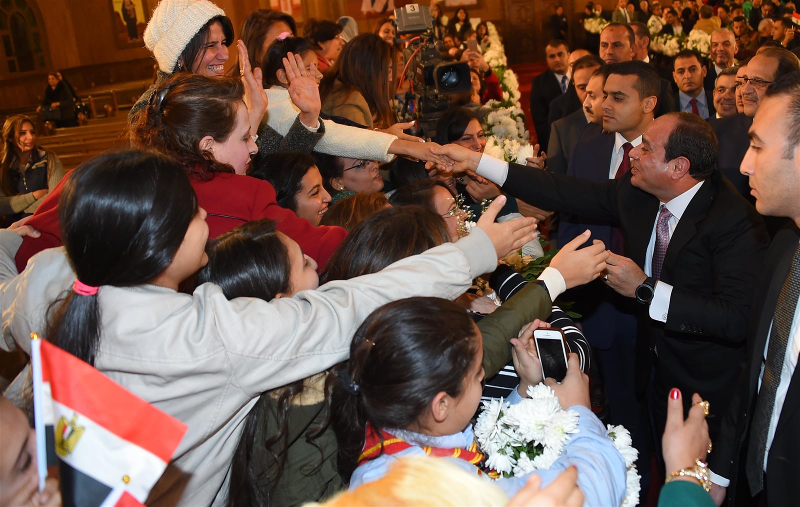 صافح الرئيس عبد الفتاح السيسي، الأقباط المشاركين فى قداس عيد الميلاد بكنيسة "ميلاد المسيح" بالعاصمة الإدارية الجديدة، لتقديم التهنئة للأقباط بمناسبة أعياد الميلاد المجيد.