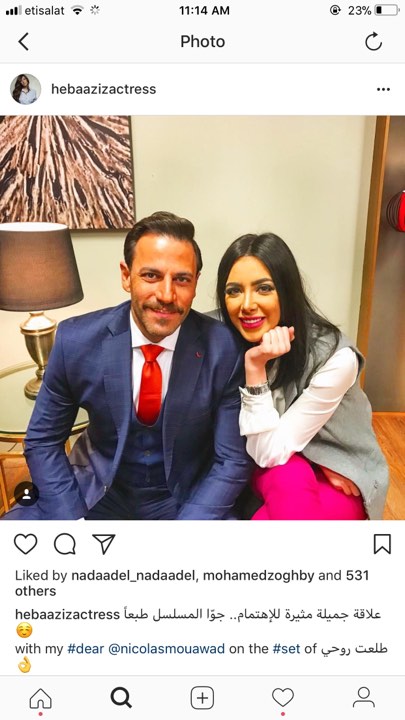 ظهرت هبة في الصورة وهي تحتضن نيقولا، وعلقت قائلة: "علاقة جميلة مثيرة للاهتمام جوا المسلسل طبعا، مسلسل جديد في التصوير مسلسل "طلعت روحي".