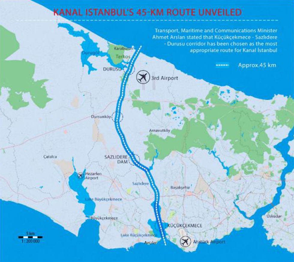 وأوضح أرسلان أن طول القناة سيبلغ 45 كيلومترا، وسيبدأ مسارها من بحيرة "كوتشوك تشكمجه" في إسطنبول إلى بحر مرمرة، وتستمر شمالا عبر سد "صازلي دره"، ومن ثم تصل للبحر الأسود شرق سد "تيرطوس" في قرية "دوروسو" بمنطقة "تشاتالجا" بإسطنبول. لافتا إلى أن القناة ستخفف الضغط على مضيق البوسفور الذي يربط طبيعيا بين البحر الأسود وبحر مرمرة.