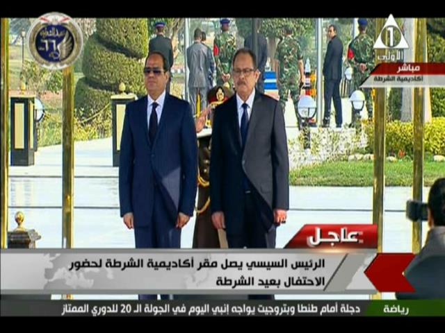 ورافق الرئيس السيسي وزير الداخلية اللواء مجدي عبد الغفار، وفور وصولهما استقبلهما حرس الشرف، وعزف السلام الجمهوري لجمهورية مصر العربية.