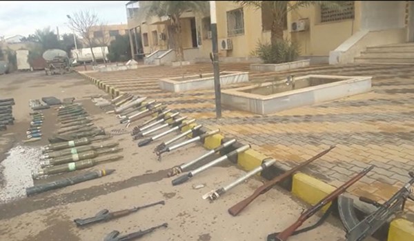 ونقلت الوكالة عن مسؤول عسكري قوله إن الأسلحة التي تم العثور عليها هي مدفع ثقيل دفنه مسلحو داعش تحت الأرض مع سبطانات احتياطية وصواريخ مضادة للطائرات وقواذف ورشاشات للصيانة غربية الصنع وحشوات وبنادق آلية وألغام متنوعة بعضها إسرائيلي الصنع وذخائر متنوعة ومواد سامة تستخدم لصناعة الأسلحة الكيميائية وأقنعة واقية وطائرة مسيرة مع قنابل وأحزمة ناسفة وأجهزة اتصالات حديثة.