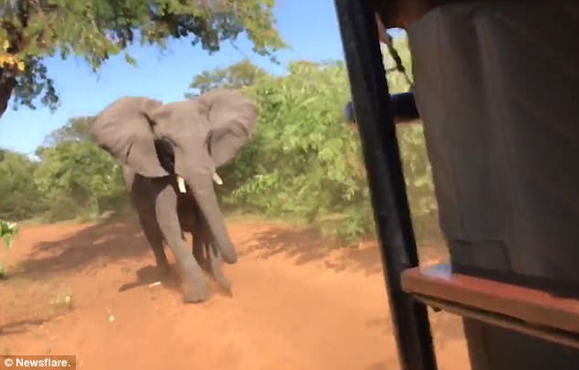 هاجم فيل بري شرس عربة تقل مجموعة من السائحين خلال رحلة سفاري بإحدى الغابات الافريقية.