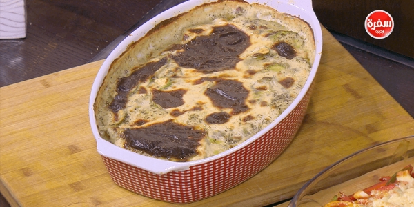 * بمجرد أن يثقل الباشميل يصب على الكوسا في الطاجن.