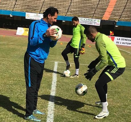 لاعبو المقاصة يجرون عمليات الإحماء استعدادا لجينيريشن فوت السنغالي
