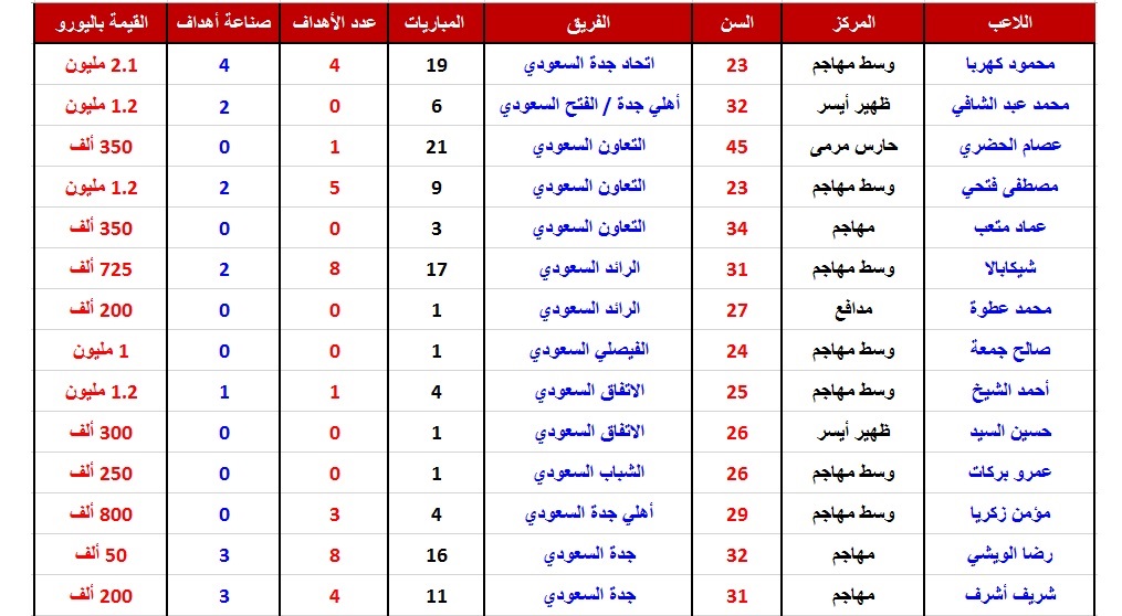 محمود كهربا (اتحاد جدة) - محمد عبد الشافي (أهلي جدة ثم الفتح) - الثلاثي عصام الحضري ومصطفى فتحي وعماد متعب (التعاون) - الثنائي شيكابالا ومحمد عطوة (الرائد) - صالح جمعة (الفيصلي) - الثنائي أحمد الشيخ وحسين السيد (الاتفاق) - عمرو بركات (الشباب) - مؤمن زكريا (أهلي جدة) - الثنائي رضا الويشي وشريف أشرف (جده) - حسام غالي (النصر ثم عاد إلى الأهلي)