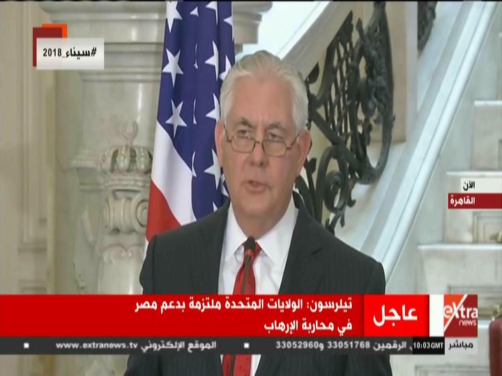 شدد وزير الخارجية الأمريكى ريكس تيلرسون على أن الولايات المتحدة ملتزمة بدعم مصر فى حربها على الإرهاب، ونحن نقوم بتقديم مليار دولار لمصر كمساعدة لدعمها بمحاربة الإرهاب ونتشارك مع مصر بعدد من الجوانب المتعلقة بمقاومة الجماعات الإرهابية والذي لا نستطيع أن نتحدث عنه بسهولة.