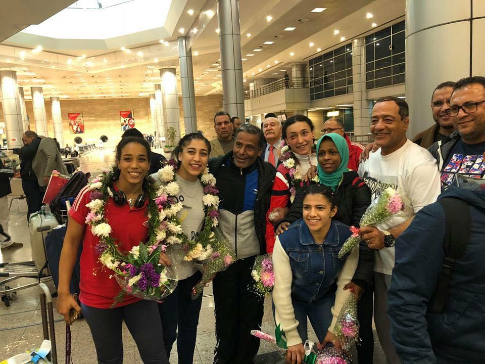 استقبال حار لأبطال المصارعة في المطار عائدين من نيجيريا.. صور