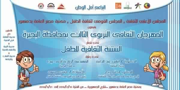 تفتتح المهندسة نادية عبده محافظ البحيرة اليوم الاحد، المهرجان الثقافي التربوي الثالث، تحت شعار "التنشئة الثقافية للطفل" بعد اعتذار الدكتور ايناس عبد الدايم وزير الثقافة عن الافتتاح، وتنظم مكتبة مصر العامة بدمنهور بالتعاون مع مديريات الثقافة والشباب والرياضة والتربية والتعليم بالبحيرة ويستمر المؤتمر لمدة 4 ايام تحت رعاية الدكتورة إيناس عبد الدايم، وزيرة الثقافة والمجلس الأعلى للثقافة والمركز القومي لثقافة الطفل.