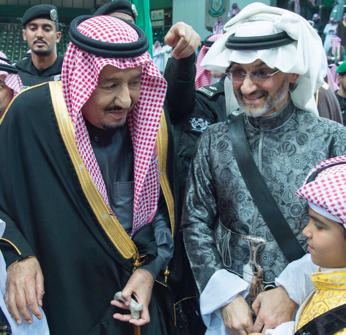 تداول نشطاء سعوديون على موقع التواصل الاجتماعي "تويتر" صور للأمير السعودي المطلق سراحه حديثا من فندق الريتز كارلتون، الوليد بن طلال ال سعود، بصحبة العاهل السعودي، الملك سلمان بن عبدالعزيز ال سعود، خلال مشاركتهما في رقصة العرضة السعودية الشهيرة، في إطار فعاليات مهرجان الجنادرية 32.