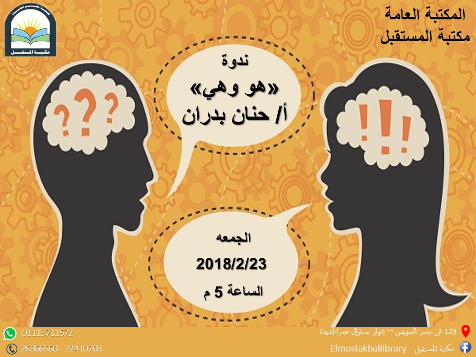 تنظم جمعية مصر الجديدة برئاسة الدكتور فاروق الجوهرى، ندوة تثقيفية في العلاقات الزوجية، بعنوان "هو وهى"، بحضور خبيرة العلاقات الزوجية حنان بدران، وعدد من الزوجات والازواج والمقبلين على الزواج، وذلك فى الخامسة من مساء غد الجمعة بمكتبة المستقبل، احدى الصروح الثقافية التابعة للجمعية، وفق ما صرح به د.نبيل حلمى سكرتير عام جمعية مصر الجديدة.