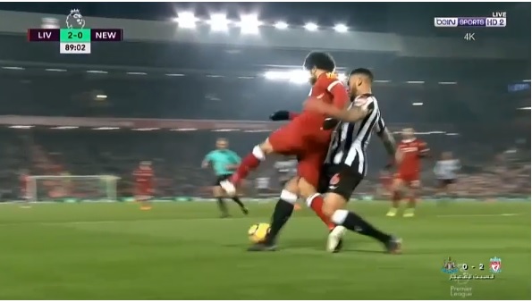 وتعرض صلاح لعرقلة واضحة من مدافع نيوكاسل داخل منطقة الجزاء في الدقيقة 89 ولكن حكم المباراة رفض احتساب ركلة جزاء ، وأمر باستمرار اللعب بغرابة شديدة