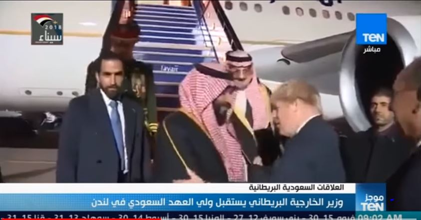 وكان في استقبال الأمير محمد بن سلمان، وزير الخارجية البريطاني بوريس جونسون، والأمير محمد بن نواف بن عبدالعزيز، سفير خادم الحرمين الشريفين لدى المملكة المتحدة، والسفير البريطاني لدى السعودية سايمون كوليز.