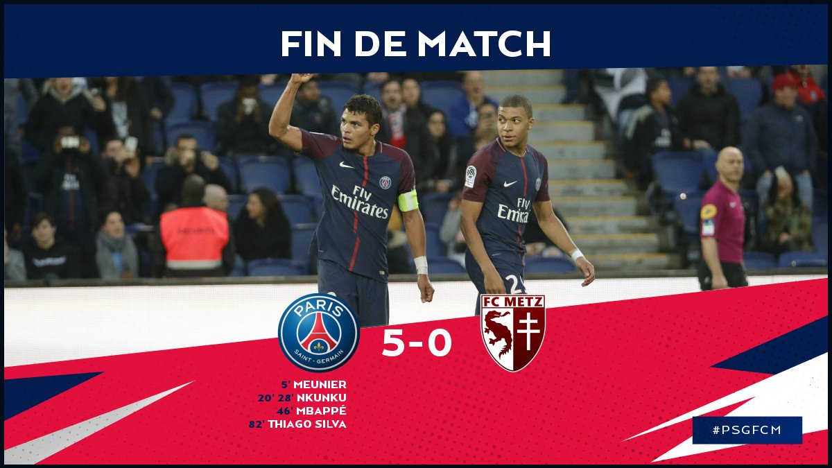سجل خماسية " البى إس جى " توماس مونيير و كريستوفر نكونكو "هدفين" و كيليان مبابي و تياجو سيلفا فى الدقائق 5 , 20 , 28 , 46 , 82 من عمر اللقاء .