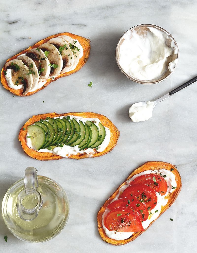 اغسلي البطاطا جيدًا وقطعيها شرائح طولية وقومى بتحميص شرائح البطاطا من الوجهين ووزعي الجبن علي كل شريحة ووزعي شرائح الخضروات عليها وزينيها بالبصل و الثوم والريحان والقليل من زيت الزيتون.
