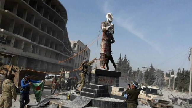 ويبدو في الصور مسلحو المعارضة السورية وهم يزيلون الرموز الكردية من صور وأعلام وتماثيل.