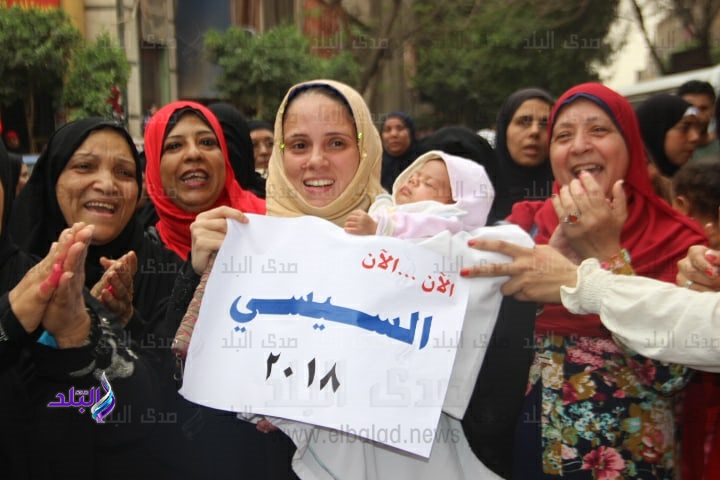 ترتدى عباءة تميل للبنى الداكن تحمل السيدة الثلاثينية وليدها الذى لم يكمل الثلاثة الأشهر من عمره .تسير بخطوات متأنية خشية إيقاظه تحمل لافتة بيضاء مبايعة صريحة مفادها: " السيسى ٢٠١٨" وما أن تصل لمقرها الإنتخابى تستقبلها الأصوات الصاخبة للأغانى الوطنية ويصدر طفلها نبرات تعبر عن استيقاظه، ويرسل إبتسامته الملائكية لوالدته.