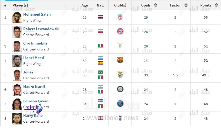 ويتساوى 3 لاعبين في المركز الثاني برصيد 26 هدفا لكل منهم، وهم المهاجم الايطالي شيرو ايموبيلي هداف لاتسيو والدوري الإيطالي، والمهاجم البولندي روبرت ليفاندوفسكي هداف بايرن ميونيخ والدوري الألماني، والنجم الأرجنتيني ليونيل ميسي هداف برشلونة والدوري الأسباني.