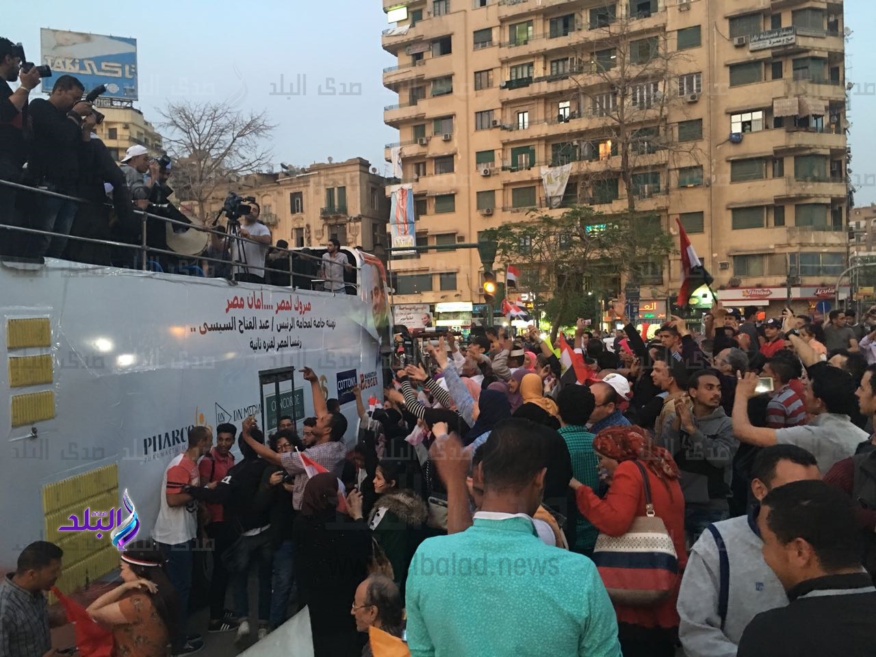 واحتفل عدد من المواطنين على طريقتهم الخاصة أعلى أتوبيس مكشوف رافعين أعلام وصور الرئيس السيسى .