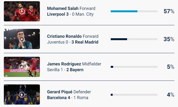 وتفوق صلاح على رونالدو بالرغم من تسجيل رونالدو هدف عالمي لفريقه ريال مدريد في مرمى يوفنتوس ليقوده للفوز 3-0 ، فيما سجل صلاح هدفا وصنع آخر ليقود فريقه ليفربول لفوز ساحق على مانشيستر سيتي 3-0