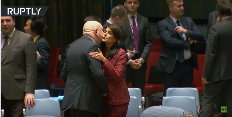 رصدت فضائية « روسيا اليوم» لقطة لمندوبة الولايات المتحدة الأمريكية " نيكي هايلي"، أثناء تقبيلها"فاسيلي نيبينزيا" مندوب روسيا بمجلس الأمن ، عقب إنتهاء جلسة مناقشة الأوضاع في روسيا التي شهدت تبادل اتهامات بين البلدين عن التورط في الجرائم التي تحدث على الأراضي الروسية .