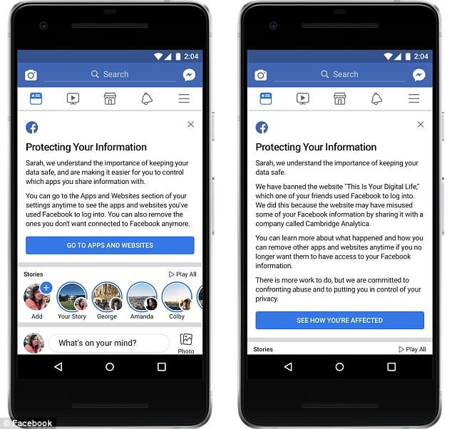 بدأ "فيسبوك" فى إرسال إشعارات للمستخدمين المحتمل مشاركة بيناتهم مع شركة "كامبريدج أناليتيكا"، المتهمة باستغلال بيانات 87 مليون مستخدم بطريقة غير لائقة، والنسبة الأكبر منهم يعيشون فى الولايات المتحدة الأمريكية بإجمالى عدد 70.6 مليون شخص، و2.7 مليون شخص آخر فى الاتحاد الأوروبي، والفلبين، وإندونيسيا، والمكسيك، وكندا، والهند، والبرازيل، وفيتنام، وأخيرًا أستراليا، بحسب "فيسبوك".