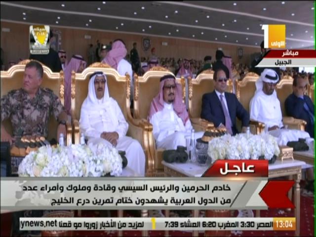 يشهد الرئيس عبد الفتاح السيسي وخادم الحرمين الشريفين الملك سلمان بن عبد العزيز وقادة وملوك وأمراء عدد من الدول العربية، فعاليات مناورات ختام تدريب درع الخليج المشترك.