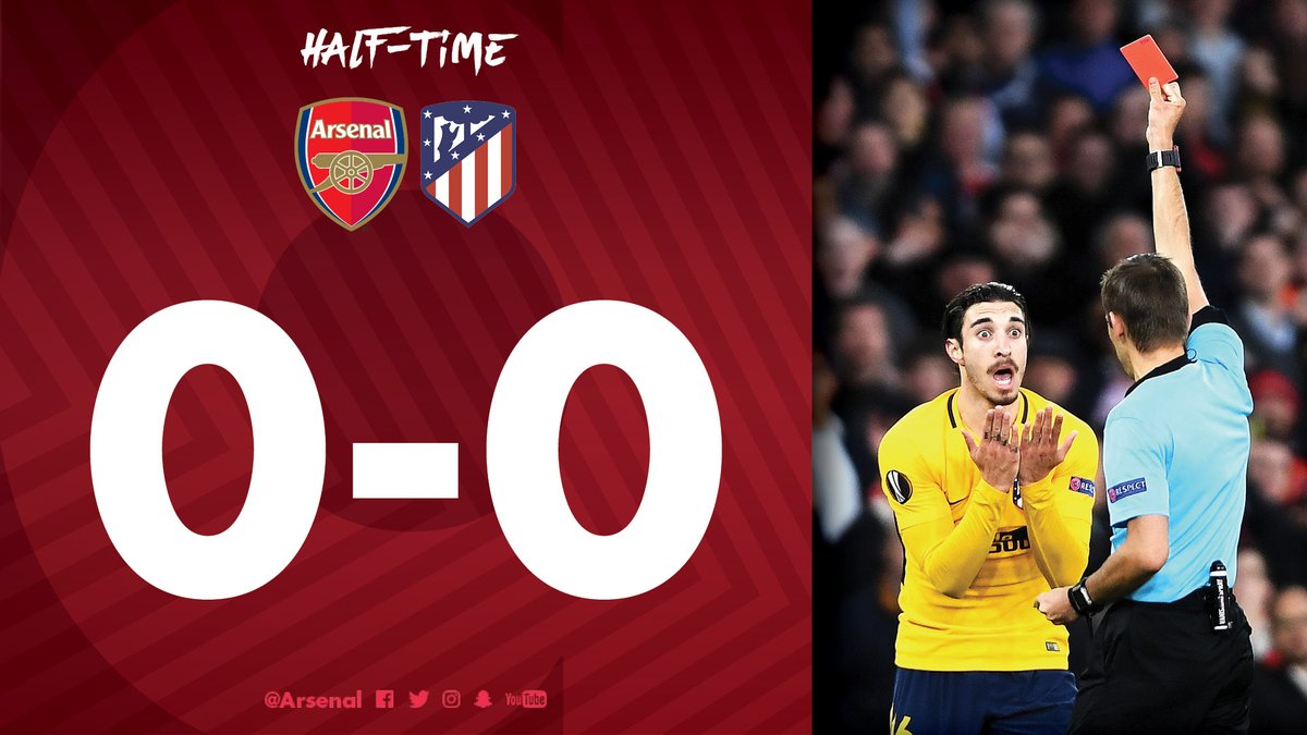 انتهى الشوط الأول لمباراة آرسنال الإنجليزى وضيفه الإسبانى أتليتكو مدريد المقامه حاليًا على ملعب الإمارات فى اطار منافسات الدور نصف النهائى من عمر بطولة الدورى الأوروبى لكرة القدم بالتعادل السلبى بين الفريقين .