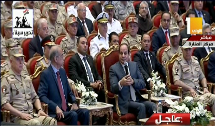 قال الرئيس عبد الفتاح السيسي، تعليقًا على جهود الجيش المصري لرد اعتباره واستعادة أرض سيناء بعد نكسة 1967، وتحقيق النصر في أكتوبر 1973، إن الجيش المصري واجه العديد من الصعوبات في هذا التوقيت، حيث أعاد الرئيس الراحل محمد أنور السادات بناءه من جديد بصعوبة شديدة شعر بها المواطن المصري، مضيفًا "أوعوا حد ياخد البلد وكلنا منتبهين وخايفين علشان اليوم ده ميتكررش تاني".