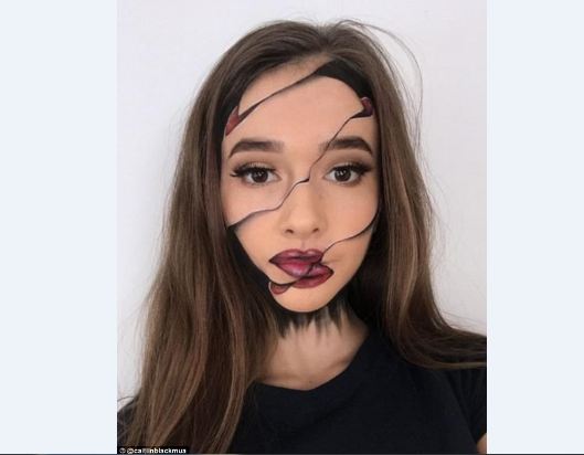 استطاعت فتاة مراهقة بعمر 16 عاما من استخدام مستحضرات التجميل، في رسم لوحات فنية بوجهها وجسدها.