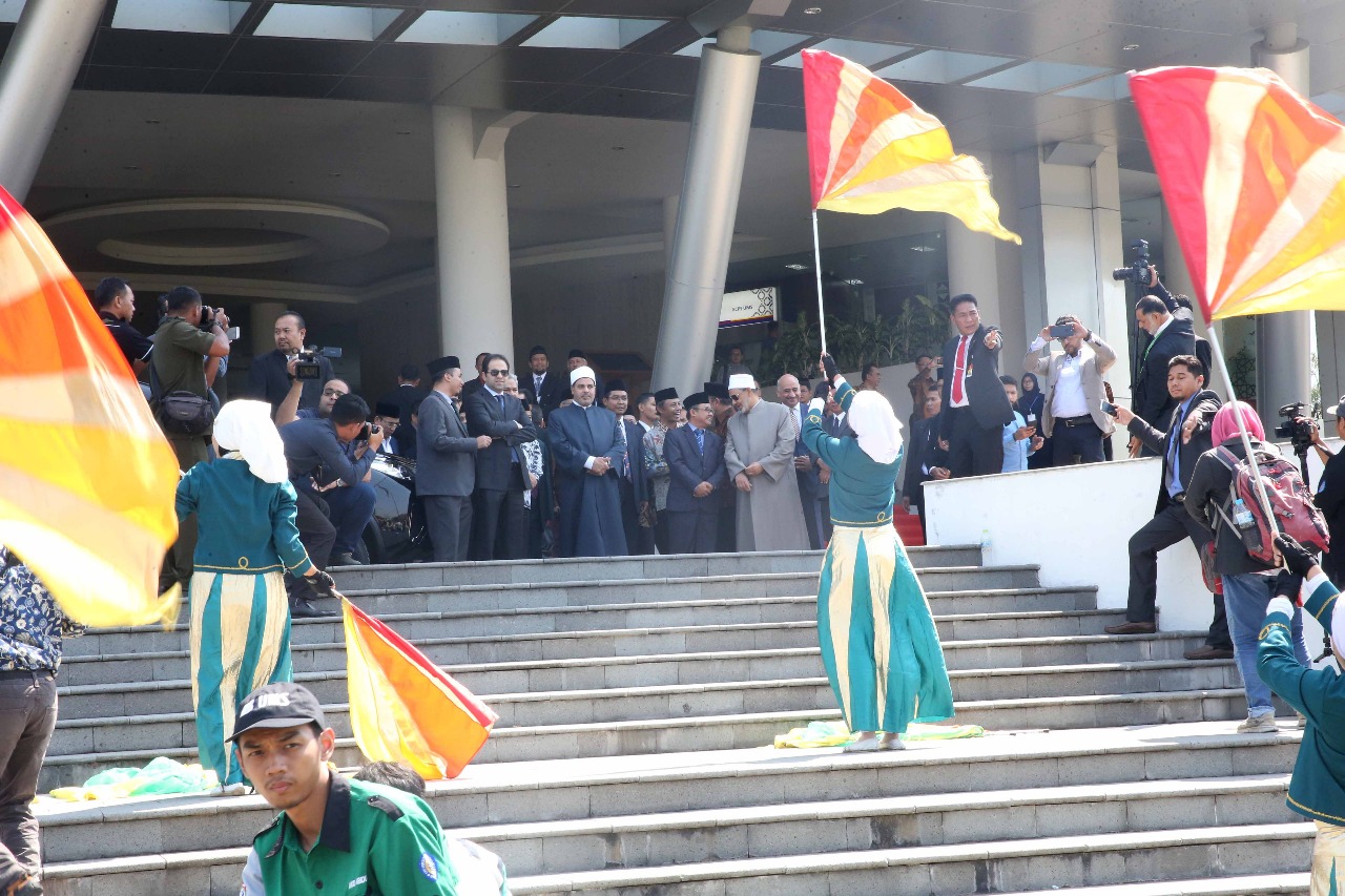 وفور وصول موكب الإمام إلى مقر الجامعة تعالت هتافات الطلاب، مرفرفين بأعلام مصر، فيما أدت مجموعة من الطالبات عرضا مصحوبا بالأغاني الشعبية الإندونيسية، لتحية فضيلته.