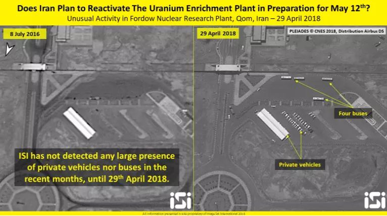 ولفتت الصحيفة إلى أن الصور تظهر إنشاء بعض المباني الجديدة داخل المنشأة بالإضافة إلى وجود سيارات وأوتوبيسات متوقفة في نطاق المنشأة، لافتة إلى أن أبواب المنشأة يمكن مشاهدتها مفتوحة لفترة طويلة بعد أن كانت قد أغلقت بعد الاتفاق النووي.