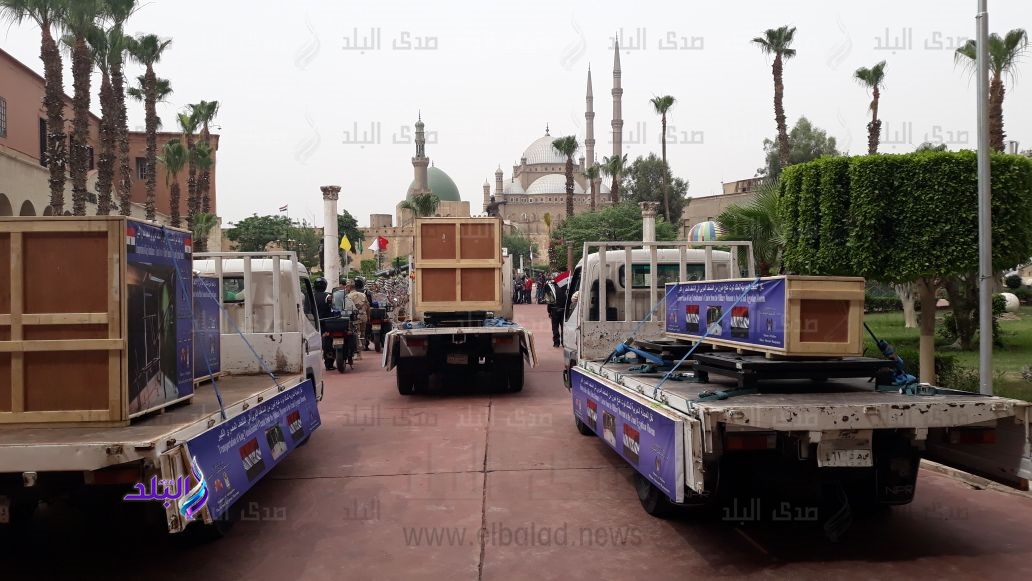 تستعد سيارات نقل عجلة توت عنخ آمون الحربية للتحرك، وذلك لنقلها من المتحف الحربي بالقلعة إلى المتحف المصري الكبير.