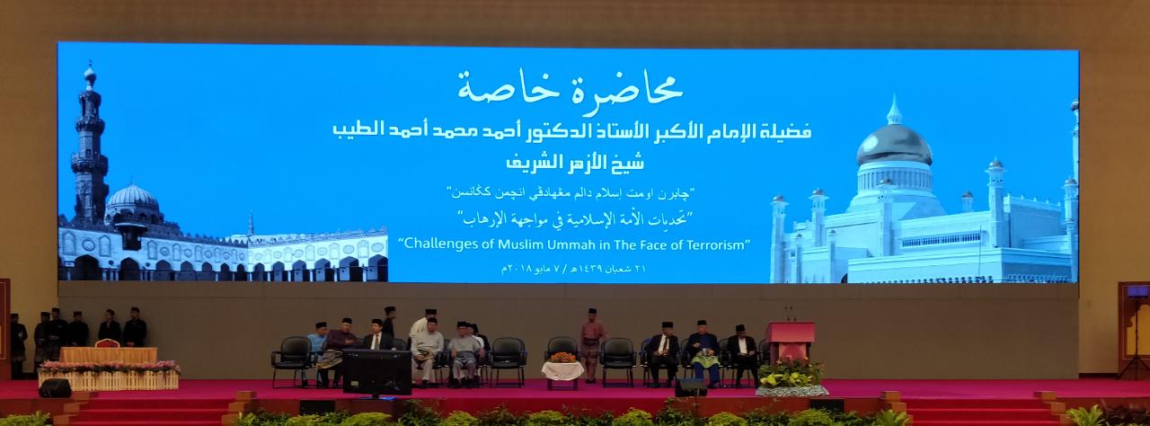 يلقى الإمام الأكبر الدكتور أحمد الطيب، شيخ الأزهر الشريف، رئيس مجلس حكماء المسلمين، اليوم الاثنين، محاضرة في مركز المؤتمرات الدولي في سلطنة بروناي –دار السلام، بعنوان "تحديات الأمة الإسلامية في مواجهة الإرهاب، وذلك في إطار زيارته الحالية لسلطنة بروناي.