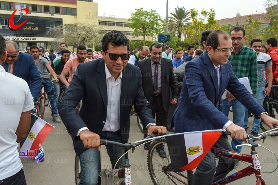 وقاد الدكتور يوسف عامر، نائب رئيس الجامعة، والدكتور أشرف فتحي عميد كلية التربية الرياضية دراجتين لمشاركة الطلاب في الماراثون.