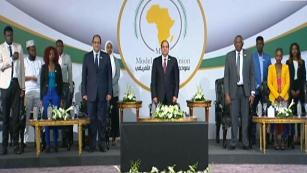 وقف الرئيس عبد الفتاح السيسي والمشاركون في مؤتمر محاكاة نموذج الاتحاد الأفريقي لتحية النشيد الوطني للاتحاد الإفريقي.