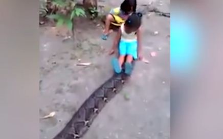 أظهرت لقطات غريبة لفتاتين صغيرتين يعتليان ثعبانًا ضخمًا وهما يضحكان دون خوف من الأفعى العملاقة، والتي يعتقد أنها من فصيلة الثعبان الشبكي، وهو واحد من أطول وأثقل الأفاعي بالعالم.
