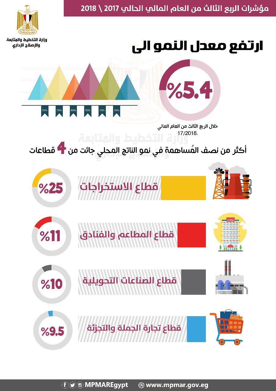 نشرت وزارة التخطيط والمتابعة والإصلاح الإداري علي صفحتها على موقع التواصل الاجتماعي "فيسبوك" انفوجراف يشير إلى ارتفاع معدل النمو الي 5.4% خلال الربع الثالث من العام المالي 17/2018.