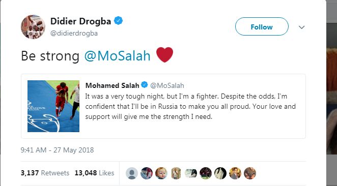 بعث النجم الإيفواري ديديه دروجبا، لاعب تشيلسي الإنجليزي السابق، رسالة دعم للمصري محمد صلاح، جناح ليفربول بعد إصابته التي تعرض لها في نهائي دوري أبطال أوروبا أمس، إثر تدخل من سيرجيو راموس مدافع ريال مدريد، وغادر ملعب المباراة بعد مرور 30 دقيقة.