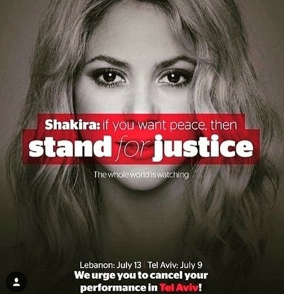 أعلنت المغنيّة شاكيرا، الغاء زيارتها الى إسرائيل لتقديم حفل غنائي كان مزمع عقده في مدينة تل أبيب في 9 يوليو، بعد حملة إعلاميّة مكثّفة لناشطين حول العالم دعوا فيها المغنيّة الكولومبيّة اللبنانيّة الأصل لإلغاء عرضها، ووجهوا لها رسائل "لا تربطي اسمك بانتهاكات إسرائيل".