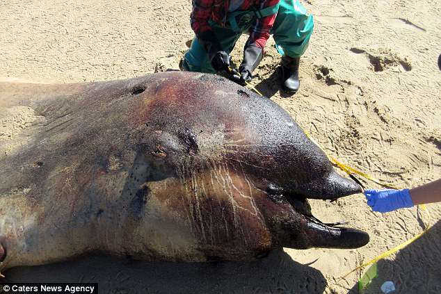 بدا الحيوان البحري الغريب وكأنه يشبه الحوت والدلفين ، ولكن حالته المتطورة من التحلل جعلت من الصعب تحديدها.
