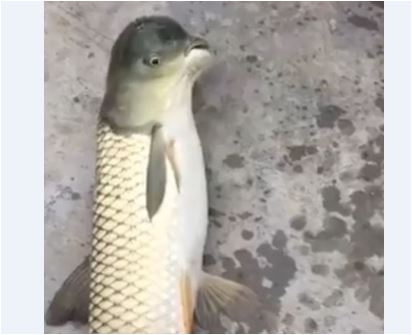 تُظهر اللقطات الصياد وهو يحمل سمكة كبيرة وغير مألوفة برأس بصلي على شكل حمامة.